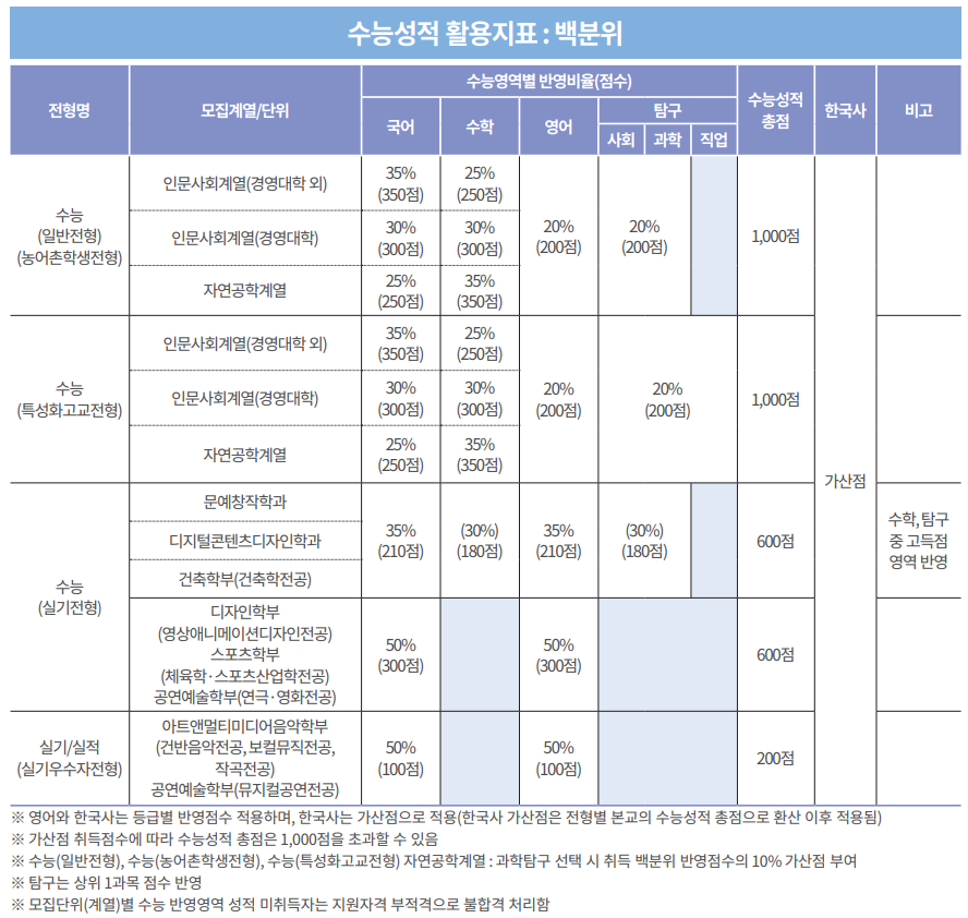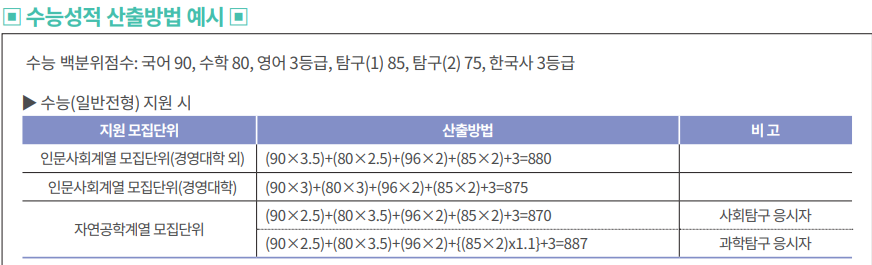 인문사회계열(경영대학 외) 국어35%, 수학25%, 영어20%, 탐구 20% 인문사회계열(경영대학) 국어30%, 수학30%, 영어20%, 탐구20% |