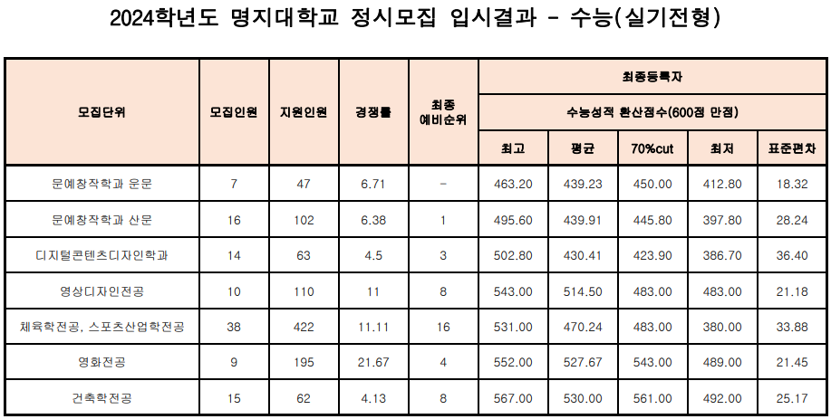 2. 2024학년도 명지대학교 정시모집 입시결과 - 수능(실기전형)