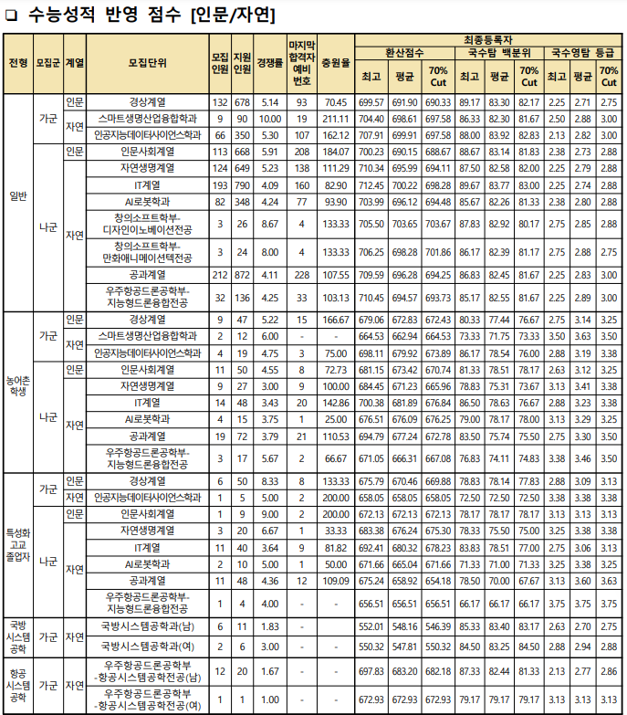 * 수능 성적 반영 총점 1000점 기준(단, 국방시스템공학과는 800점 만점)