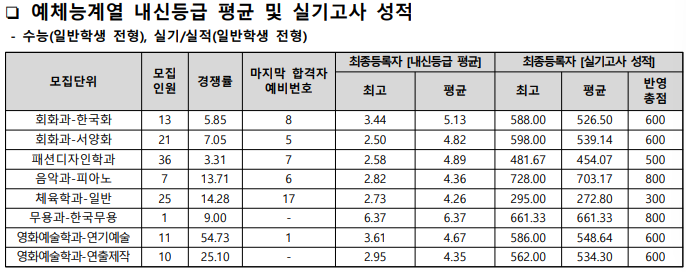 세종대 정시 입시 결과 예체능계열 내신등급 평균 및