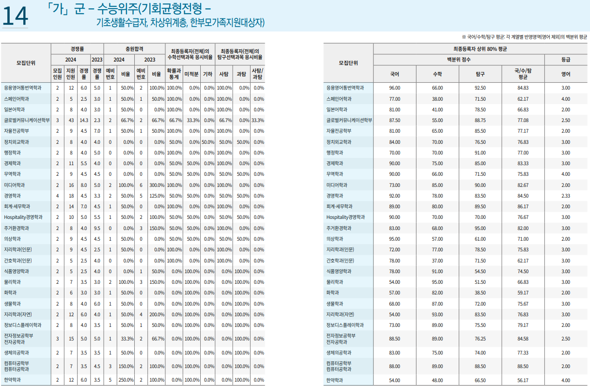 4. 2024학년도 경희대 정시 입시결과 - 가군 수능위주(기회균형-기초생활수급자, 차상위계층, 한부모가족지원대상자) 전형