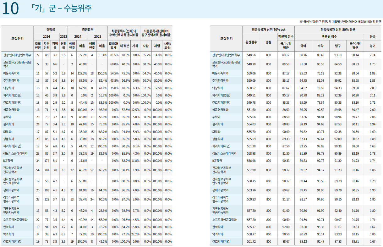 경희대 정시 가군 수능 위주 최종등록자 상위 80% 평균 백분위 점수 top3위 학과