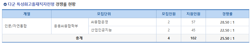 마지막으로 성균관대 정시 다군의 특성화고졸재직자전형 경쟁률 현황입니다. 응용AI융합학부의 AI 융합운영, 산업인공지능학부에서만 모집을 하였으며, 각각 28.5:1, 22.5:1이라는 정시임에도 높은 경쟁률을 기록했습니다.