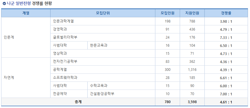 성균관대 정시 경쟁률 나군 일반전형의 경쟁률을 살펴보겠습니다. 이 전형에서는 780명을 모집하였으며, 3,598명이 지원해 4.61:1의 경쟁률을 기록했습니다. 모집단위가 많지 않아서 2위까지 알아보겠습니다.