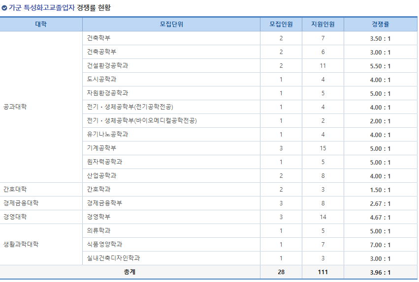 그 다음으로는 한양대 정시 가군의 특성화고교 졸업자 전형과 특수교육대상자전형의 경쟁률입니다. 각각 모집단위가 많지않아서 순위는 매기지 않겠습니다! 특히 특수교육대상자전형의 경우 모집단위가 학과가 아니라 여러 대학을 합쳐서 모집을 하기 때문에, 지원시에 조금 더 신경을 써야겠습니다.