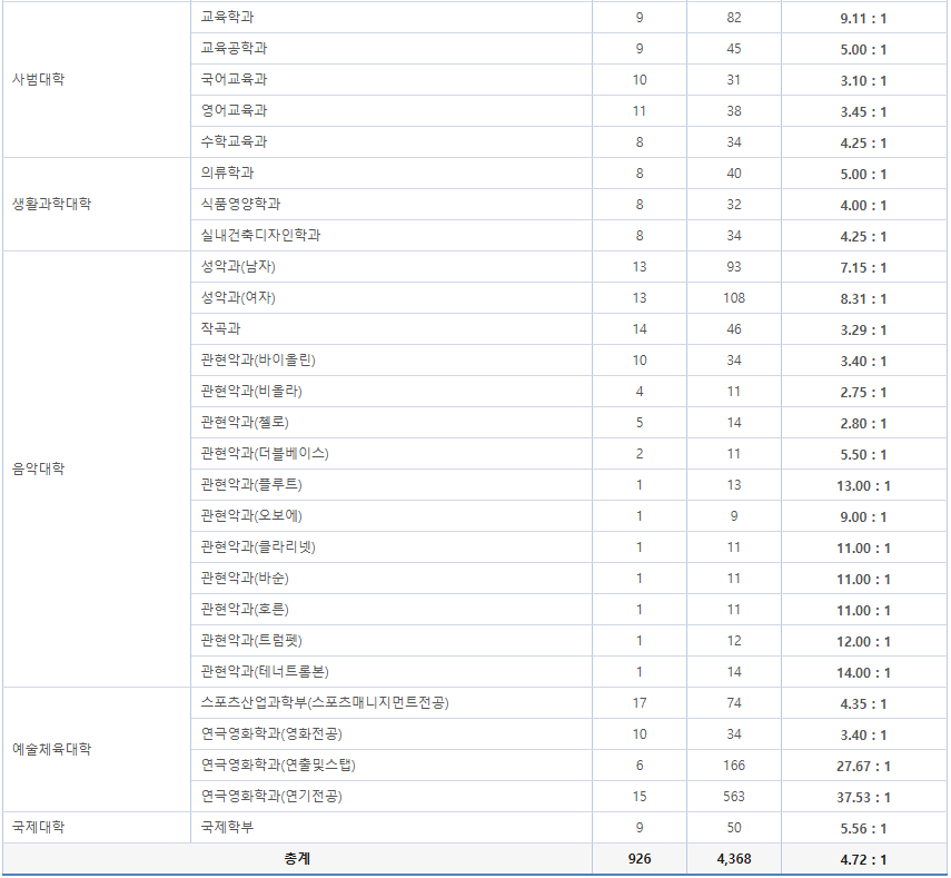 1위 : 예술체육대학 연극영화학과(연기전공) 15명 모집 563명 지원 37.53:1