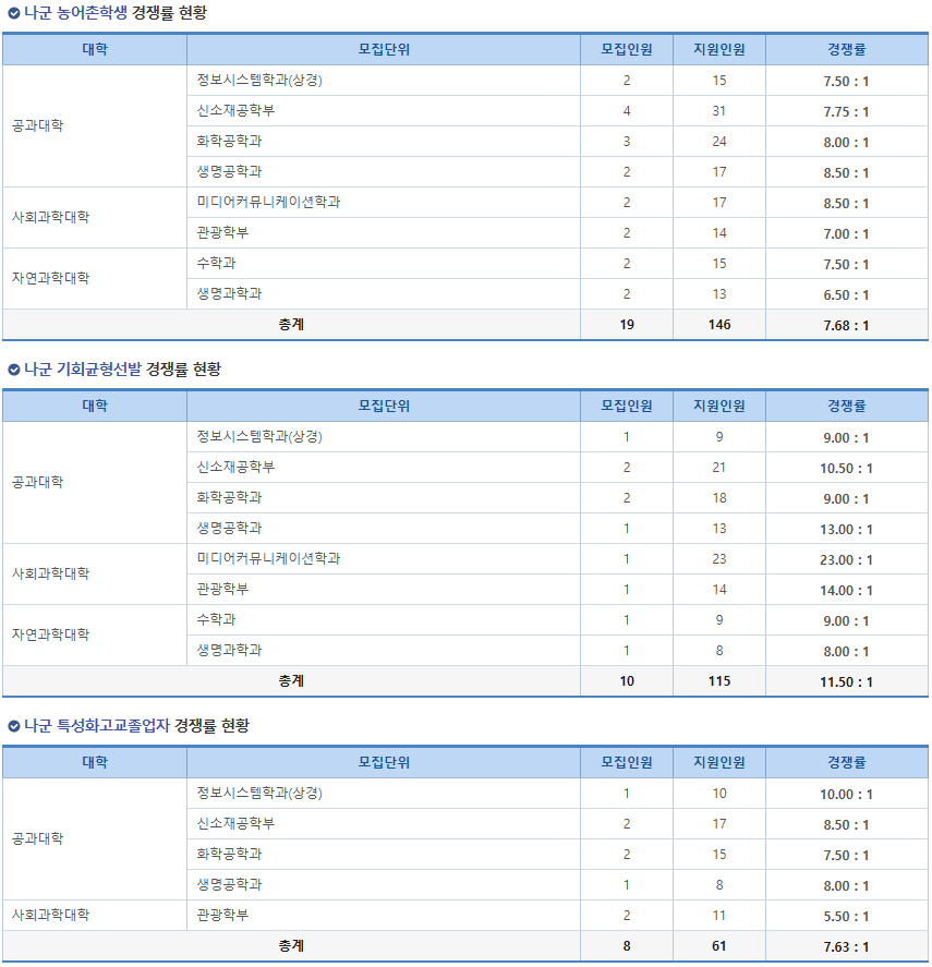 7. 한양대 정시 경쟁률 나군 농어촌학생/기회균형선발/특성화고교졸업자 경쟁률 현황