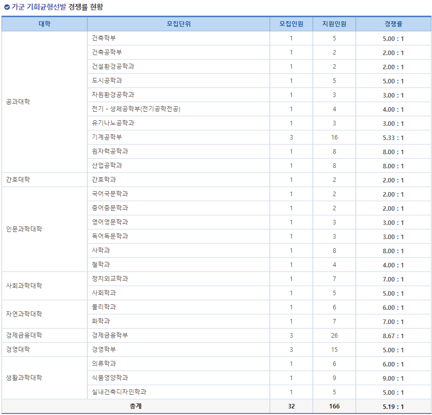그 다음은 한양대 정시 기회균형선발 전형의 경쟁률입니다. 총 32명을 모집한 가운데, 166명이 지원해 5.19:1의 경쟁률을 기록했습니다. 해당 전형에서는 모집단위가 매우 적었네요. 1명을 뽑는 학과가 굉장히 많았습니다.