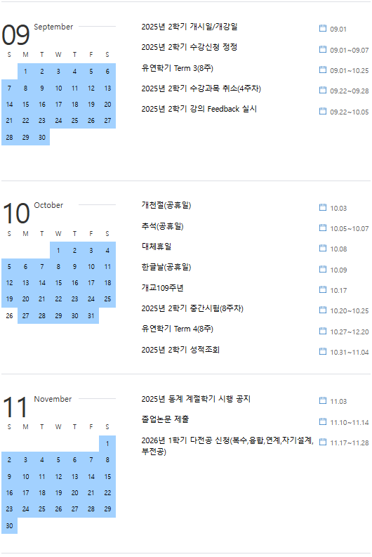 중앙대 학사일정 9,10,11,12월