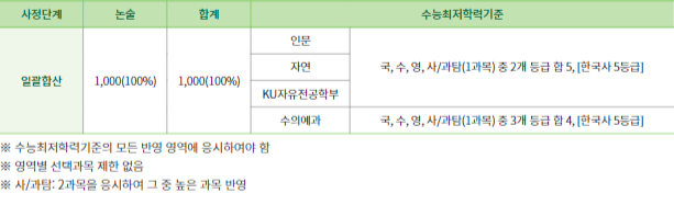 인문, 자연, KU자유전공학부의 경우 국,수,영,사/과탐(1) 중 2개 등급 합 5등급, 한국사 5등급
