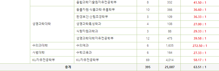 대망의 건국대 수시 논술(KU논술우수자) 경쟁률 현황도 알아보겠습니다. 건국대학교 논술전형은 전체 63.51:1의 경쟁률로 다른 전형들 중 가장 높은 경쟁률을 기록했습니다. 가장 인기가 많았던 학과는 역시 건국대학교의 간판 학과인 수의과대학의 수의예과로, 6명 모집에 1,635명이라는 아주 많은 수의 학생들이 지원했습니다. 경쟁률은 무려 272.5:1로, 다른 학과 경쟁률의 몇배에 달합니다.