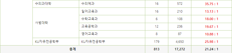 그 다음으로는 건국대 수시 학생부종합 전형인 KU 자기추천 전형의 경쟁률 현황입니다. 해당 전형을 통해 전체 813명을 모집하였으며 17,272명이 이에 지원해 전체 경쟁률은 21.24:1에 달했습니다.