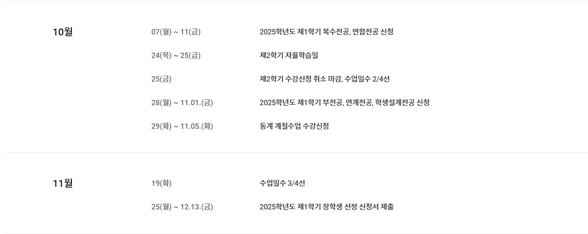 두번째로 10월 25일(금)에 제2학기 수강신청 취소가 마감이 되며, 28일 월요일부터 11월 1일 금요일까지 2025학년도 제1학기 부전공, 연계전공, 학생설계전공 신청이 진행됩니다. 그 후 10월 29일 화요일부터 11월 5일 화요일까지는 동계 계절수업 수강신청이 진행되니, 겨울방학 계절학기 수업을 생각하는 서울대생이라면 놓치지 말고 지원하시기 바랍니다.