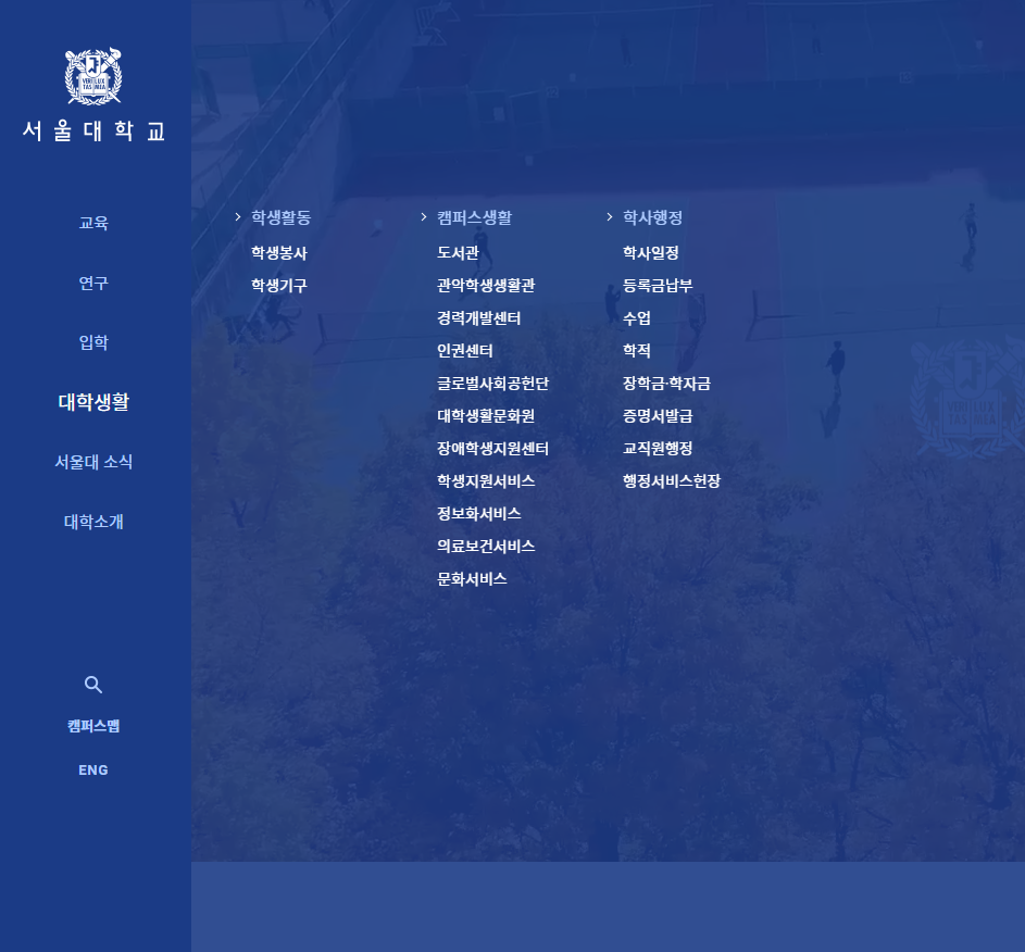정답은 바로 '대학생활' 카테고리에 있습니다. 서울대학교 공식 홈페이지가 바뀐다 해도, 대학생활 카테고리를 찾으시면 학사일정 찾는 것이 쉬워지실거예요!