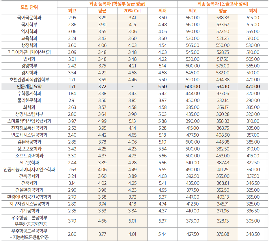 인문계열의 경우 평균적으로 3.72등급의 내신 성적을 가진 학생들이 합격을 했으며, 5.50선에서 합격한 학생도 있었습니다. 자연계열도 마찬가지로 평균적으로 3.87등급의 내신성적으로 합격한 것이 보입니다.