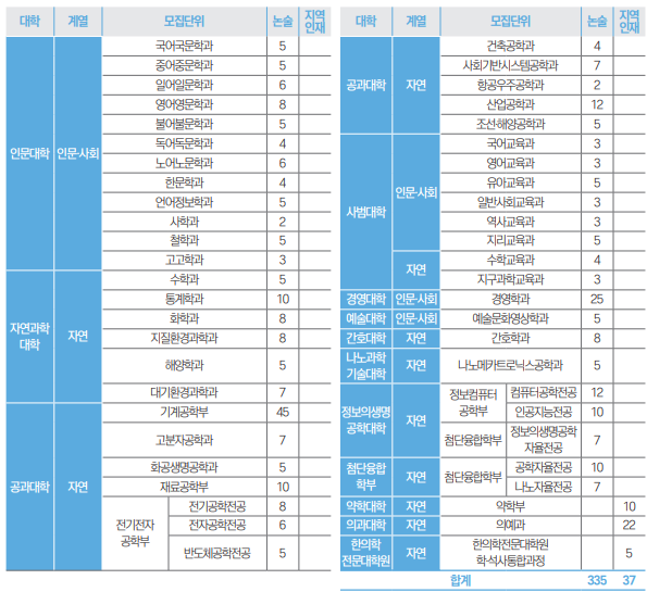 | 자연과학대학(대기환경과학과 제외), 공과대학, 사범대학, 간호대학, 나노과학기술대학, 정보의생명공학대학 해당모집단위(정보의생명공학대학 첨단융합학부(정보의생명공학자율전공) 포함 첨단융합학부(나노자율전공) |