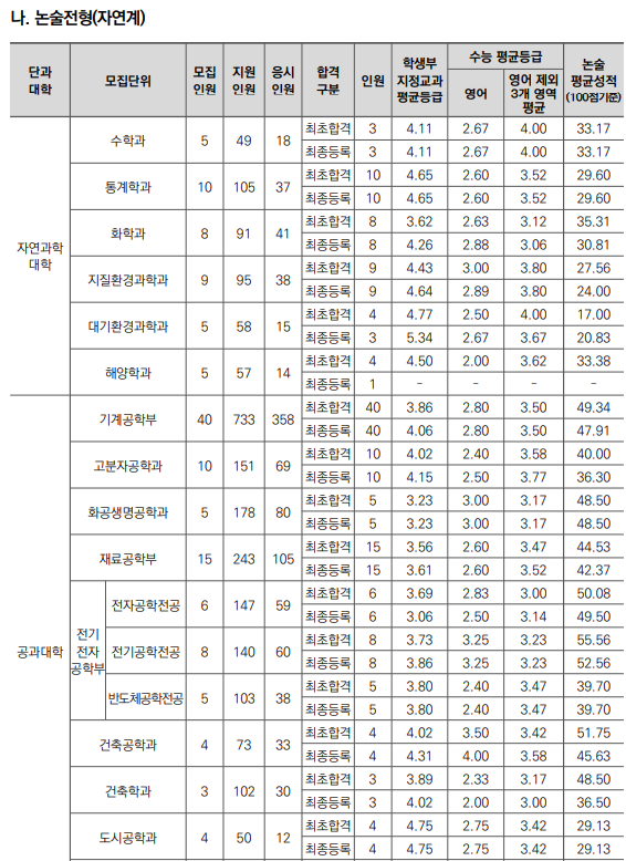 ▶부산대 논술 (자연계) 학생부 평균등급, 수능 평균등급, 논술 성적