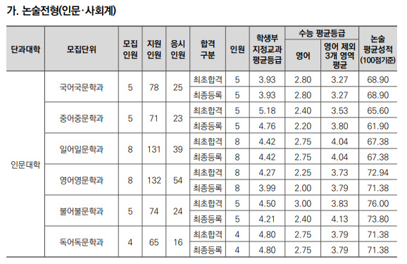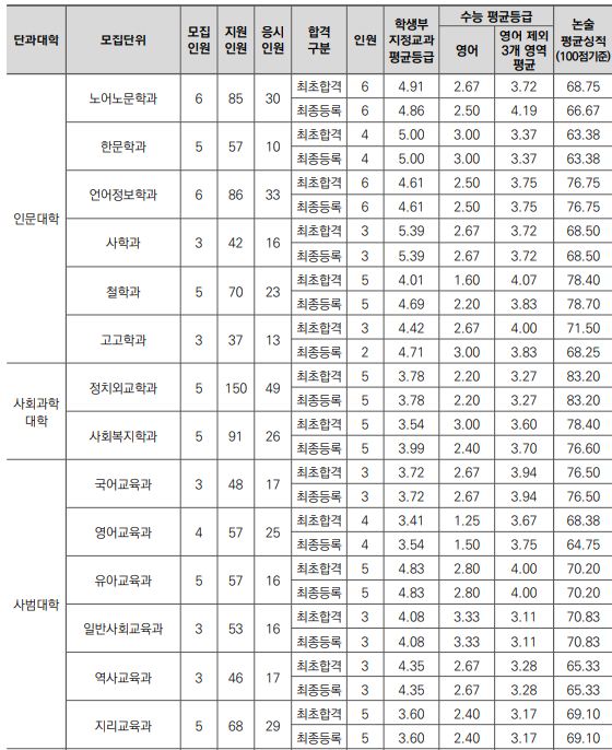 | 인문대학, 사범대학, 예술대학 해당 모집단위 |