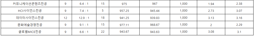 그 다음으로는 문예창작전공으로, 경쟁률은 26:1이었으며, 5명 모집에, 추합 순위는 2명까지 빠졌습니다. 그밖에도 화장품학전공(24.7:1),, 문화예술경영전공(23.3:1), 약학과(22.3:1)의 경쟁률이 높아 여학생들에게 인기가 많았습니다.